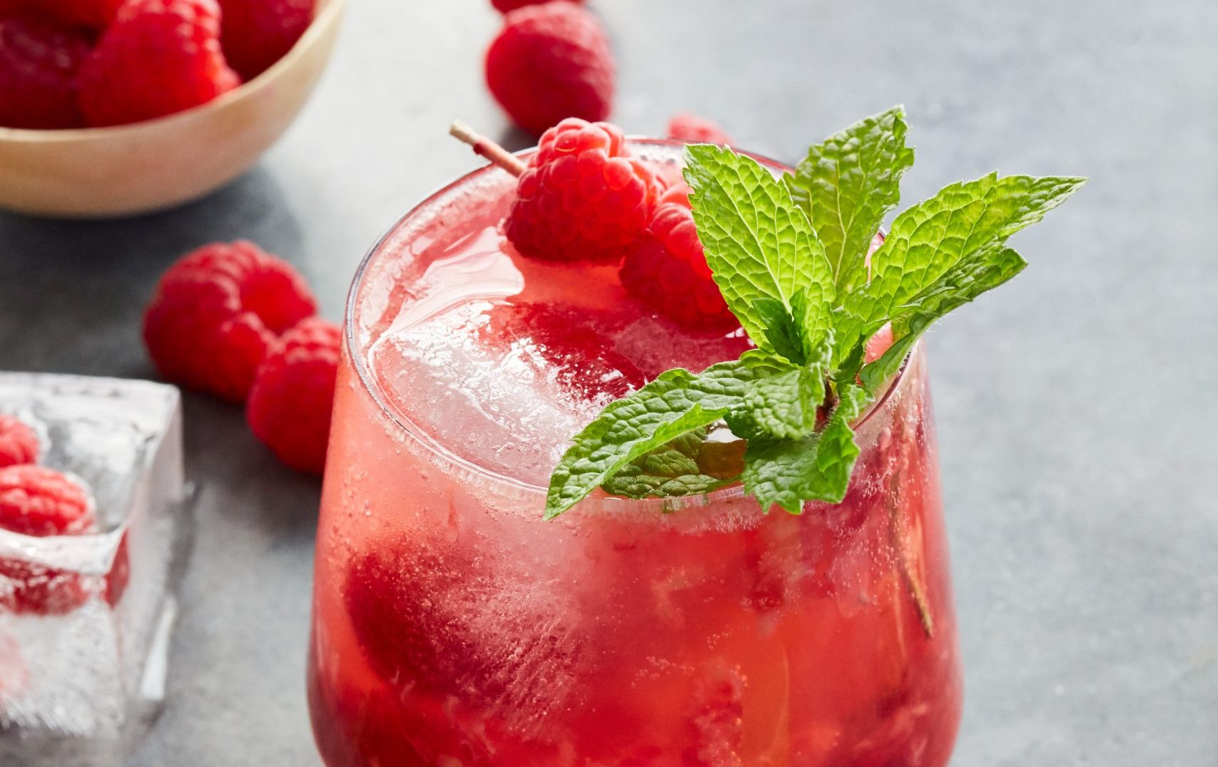 Garnishes: Frozen Raspberries, Slice of Lime, Rosemary or Mint
